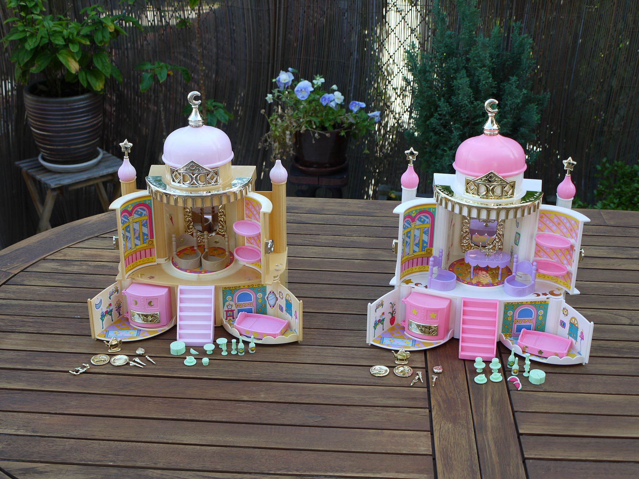 J'ai d'abord acheté le château de gauche, mais il manquait certaines pièces. J'ai donc racheté le château de droite (en boîte, avec tous les stickers). La coloration jaune de celui de gauche est dûe au temps. Je l'ai offert à ma nièce Elicia.